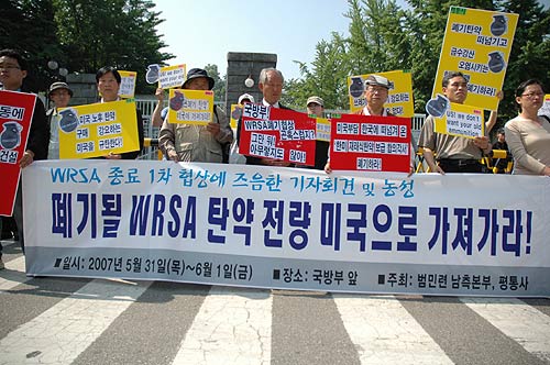 31ÀÏ ¿ÀÀü 9½Ã30ºÐ ±¹¹æºÎ Á¤¹® ¾Õ¿¡¼ ±âÀÚȸ°ßÀ» ¿°í ¡®Æó±âµÉ ÀüÀºñ¹°ÀÚ(WRSA-K)