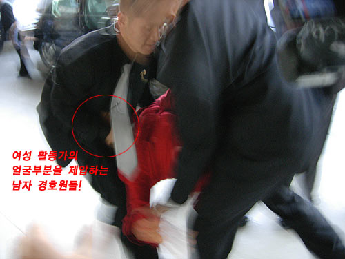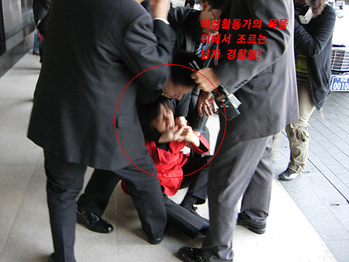 ¡â³²¼º °æÂûµéÀÌ À¯ÇѰæ(¿©¼º)ȸ¿øÀÇ ¾ó±¼¿¡ ½Å¹®Áö·Î µ¤°í ¼ÕÀ¸·Î ´©¸£°í ÀÖ´Â »óȲ