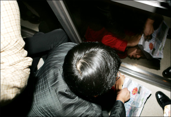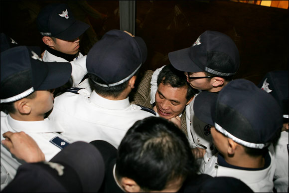 ¡â¼ö½Ê¸íÀÇ °æÂûµé¿¡ ÀÇÇØ ¸ñÀÌ Á¹¸°Ã¤ ¾ÐÂø´çÇØ °Ç¹° º®À¸·Î ¸ô¸®°í ÀÖ´Â »óȲ