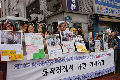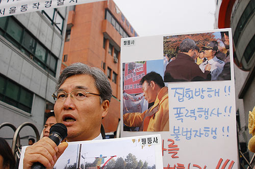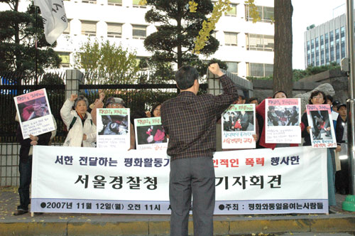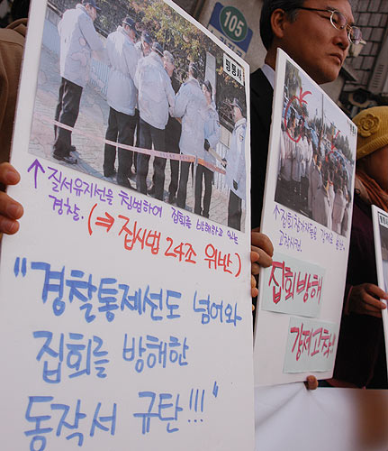 " ÇÕ¹ýÀûÀ¸·Î ½Å°íµÈ Áýȸ¿¡ ´ëÇØ °æÂû ½º½º·Î ÃijõÀº Æú¸®½º ¶óÀÎÀ» ³Ñ¾î¿Í Âü°¡ÀÚµéÀ» Æø·ÂÀûÀ¸·Î °íÂø½Ã۰í Çö¼ö¸·°ú ÇÇÄÏ µî ½ÃÀ§¿ëǰÀ» ÆÄ¼ÕÇÏ´Â µî Áýȸ¸¦ ºÒ¹ýÀûÀ¸·Î ź¾ÐÇÏ´Â µ¿ÀÛ°æÂû¼ Ã¥ÀÓÀÚ¸¦ ó¹úÇ϶ó"