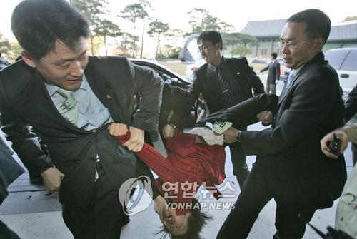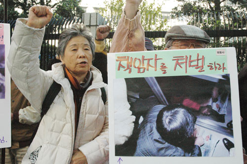 ¡â¿©¼ºÈ¸¿øÀ» Â÷°¡¿î ½Ã¸àÆ® ¹Ù´Ú¿¡ ³Ñ¾î¶ß·Á ³õ°í ½Å¹®Áö°í ¾ó±¼À» µ¤°í ÀÖ´Â ³²¼º°æÂû