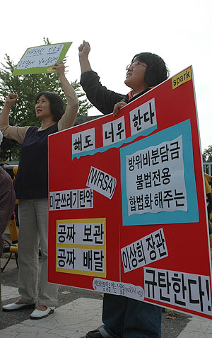 ÀÌ¿¡ ÆòÈ¿Í ÅëÀÏÀ» ¿©´Â »ç¶÷µéÀº 8ÀÏ ±¹¹æºÎ ¾Õ¿¡¼ ¹æÀ§ºñ ºÐ´ã±Ý ºÒ¹ýÀü¿ëÀ» Á¤´çÈÇÏ´Â ÀÌ»óÈñ ±¹¹æºÎÀå°üÀÇ ÅðÁø°ú ¹Ì±º ¾²·¹±âź¾à(WRSA)À» »çµéÀÌ·Á´Â ±¹¹æºÎ¿¡ ´ëÇÑ Ã¶ÀúÇÑ ±¹Á¤°¨»ç¸¦ ¿ä±¸ÇÏ´Â ±âÀÚȸ°ßÀ» °³ÃÖÇÏ¿´´Ù.