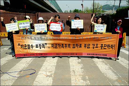 ¹Ì±¹ÀÌ ÆòÅÿ¡ Áö¾îÁú ¹Ì±º°¡Á·ÁÖÅÿ¡ ´ëÇÑ º¸ÁõÀ» Çѱ¹ Á¤ºÎ¿¡ ¿ä±¸Çؼ ³í¶õÀÌ µÇ°í ÀÖ´Â °¡¿îµ¥ ÆòÅë»ç°¡ À̸¦ ±ÔźÇÏ´Â ±âÀÚȸ°ßÀ» ³ëµ¿ÀýÀÎ 5¿ù 1ÀÏ ¿ÀÀü ÁÖÇѹ̱º»ç·ÉºÎ 5¹ø °ÔÀÌÆ® ¾Õ¿¡¼ ÁøÇàÇß½À´Ï´Ù.