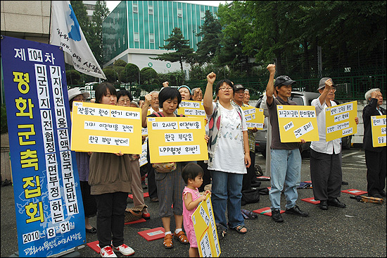ÀÌ¿¡ ÆòÈ¿Í ÅëÀÏÀ» ¿©´Â »ç¶÷µéÀº 31ÀÏ 12½Ã ±¹¹æºÎ ¹Î¿ø½Ç ¾Õ¿¡¼´Â ¡°¹Ì±º±âÁö ÀÌÀüÇùÁ¤(LPP) Àü¸é ºÎÁ¤ÇÏ´Â ±âÁö ÀÌÀüºñ¿ë Àü¾× Çѱ¹ ºÎ´ã ¹Ý´ë! 104Â÷ ÆòȱºÃàÁýȸ¡±¸¦ ÁøÇàÇÏ¿´½À´Ï´Ù.