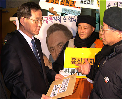 [»çÁø - ÆòÈ¿ÍÅëÀÏÀ»¿©´Â»ç¶÷µé]ÈûÂù ±¸È£¸¦ ¿ÜÄ¡¸é Çù»ó´ëÇ¥´ÜÀ» ±â´Ù¸®´ø Âü°¡ÀÚµéÀº ¿ÀÈÄ 7½Ã20ºÐÂë Â÷¿µ±¸ ±¹¹æºÎ Á¤Ã¥½ÇÀåÀÌ ±Íºó½Ç¿¡¼ ³ª¿Í Ãâ±¹ÀåÀ¸·Î ÇâÇØ°¡´Â ¸ð½ÀÀ» º¸°í, ¼ÇÑÀ» Àü´ÞÇϱâ À§ÇØ Â÷¿µ±¸ Á¤Ã¥½ÇÀå¿¡°Ô ´Ù°¡°¬½À´Ï´Ù. È«±Ù¼ö ÆòÅë»ç »óÀÓ´ëÇ¥´Â Â÷¿µ±¸ Á¤Ã¥½ÇÀå¿¡°Ô "±¼¿åÀûÀÎ ¿ë»ê±âÁö ÀÌÀüÇù»óÀ» Áß´ÜÇϰí Àü¸éÀçÇù»óÀ» Ã˱¸ÇÏ°í ¿ë»ê±âÁö ÀÜ·ùºÎÁö 20¸¸Æò Á¦°øÀ» ¹Ý´ëÇÑ´Ù"¸ç "Çù»ó´ëÇ¥´ÜÀÌ ±¹¹ÎÀÇ ¹Ù·¥À» Àú¹ö¸°´Ù¸é °áÄÚ ¿ë³³ÇÏÁö ¾ÊÀ» °Í"À̶ó°í ¹àÈ÷¸ç Â÷¿µ±¸ Á¤Ã¥½ÇÀå¿¡°Ô ¼ÇÑÀ» Àü´ÞÇß½À´Ï´Ù.