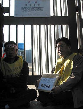 ´ëÇ¥´ÜÀÌ Ç×ÀÇ ¼ÇÑÀ» Àü´ÞÇÏ·ÁÇÏÀÚ °æÂûÀÌ ¸·°í ³ª¼¹´Ù. ´ëÇ¥´ÜÀº ±× ÀÚ¸®¿¡ ÁÖÀú¾É¾Æ ħ¹¬½ÃÀ§¸¦ Çß´Ù.