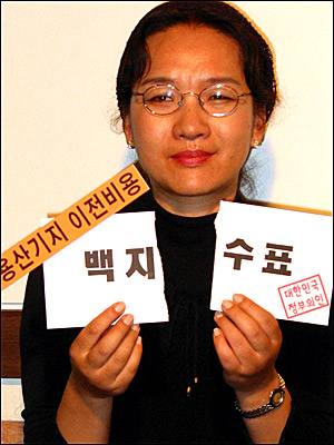 ¡ã Âü¼®ÀÚµéÀº ¹Ì±¹¿¡ '¹éÁö¼öÇ¥'¸¦ Á¦°øÇÏ´Â °ÍÀ̳ª ´Ù¸§¾ø´Â ¿ë»ê±âÁö ÀÌÀüÇù»óÀ» ´Ù½ÃÇ϶ó´Â Àǹ̷Π'¹éÁö¼öÇ¥' »ó¡ ÇÇÄÏÀ» ºÎ½¥´Ù. [»çÁø - ÆòÈ¿ÍÅëÀÏÀ»¿©´Â»ç¶÷µé]