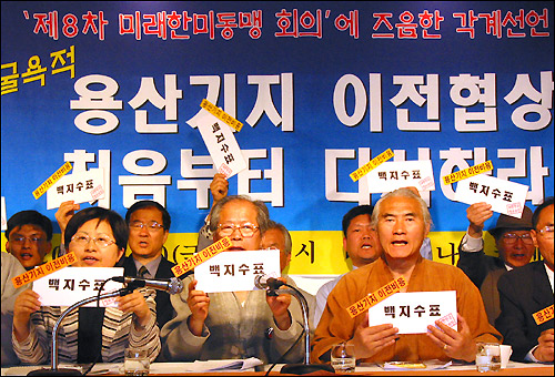 ÆòÅë»ç È«±Ù¼ö »óÀÓ´ëÇ¥¿Í Çѱ¹¿©¼º´Üü¿¬ÇÕ Á¤Çö¹é °øµ¿´ëÇ¥°¡ ³¶µ¶ÇÑ ¼±¾ð¹®À» ÅëÇØ Á¤ºÎ°¡ ±Ù°Å¸¦ Á¦½ÃÇÏÁöµµ ¾Ê°í ¹Ì±¹ ±¹¹æºÎ°¡ »êÁ¤ÇÑ ¿ë»ê ¹Ì±º±âÁöÀÇ ½Ã¼³´ëü°¡Ä¡ 13¾ï ´Þ·¯º¸´Ù ¸î ¹è ¸¹Àº 30¡50¾ï ´Þ·¯¸¦ ÀÌÀüºñ¿ëÀ¸·Î Ãß»êÇϰí ÀÖ´Ù¸ç ÀÌ·¯ÇÑ Á¹¼ÓÀûÀÎ Çù»óÀ» ÁßÁöÇϰí Àü¸é ÀçÇù»óÇÒ °ÍÀ» Ã˱¸ÇÏ¿´½À´Ï´Ù. ¶ÇÇÑ 2006³â±îÁö 1¸¸ 2õ¸íÀÇ ÁÖÇѹ̱ºÀ» °¨ÃàÇÏ·Á´Â ¹Ì±¹ÀÇ °èȹÀ» ¹Ý¿µÇϱâ À§Çؼµµ ¿ë»ê Çù»óÀº Àç°ËÅäµÇ¾î¾ß Çϸç, À̹ø ȸÀÇ¿¡¼ Çѹ̾籹ÀÌ ¿ë»ê±âÁö ÀÌÀü Çù»ó ¾È¿¡ °¡¼¸íÇÑ´Ù¸é ¿Â ±¹¹Î°ú ´õºÒ¾î ±¼¿åÀûÀÎ ÇùÁ¤À» ¹Ý´ëÇÏ´Â ÅõÀï¿¡ ³ª¼³ °ÍÀ̶ó°í ¹àÇû½À´Ï´Ù.