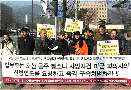 ¿À´Ã ¿ÀÀü 11½Ã °úõ Á¤ºÎÁ¾ÇÕû»ç Á¤¹® ¾Õ¿¡¼ '¿À»ê À½ÁÖ »±¼Ò´Ï »ç¸Á»ç°Ç ¹Ì±ºÇÇÀÇÀÚ ±¸¼Ó±â¼Ò Ã˱¸ ¹ý¹«ºÎ ¾Õ ±âÀÚȸ°ß'À» ÁøÇàÇß½À´Ï´Ù.