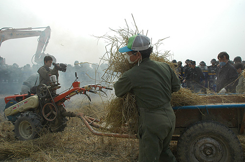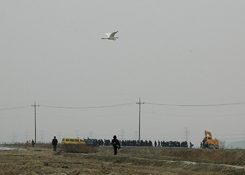 ¡â ³»¸® ÀÔ±¸, ÇϾá Çï¸ä°ú ¹æÆÐ·Î ¹«ÀåÇÑ ¿ë¿ª¾÷ü Á÷¿øµé, Æ®·°¿¡ ½Ç¸° Æ÷Å©·¹ÀÎ. ±× µÚ·Î ¼öõ¸íÀÇ »õ±î¸¸ °æÂûµéÀÌ µÚµû¸£°í ÀÖ´Ù.