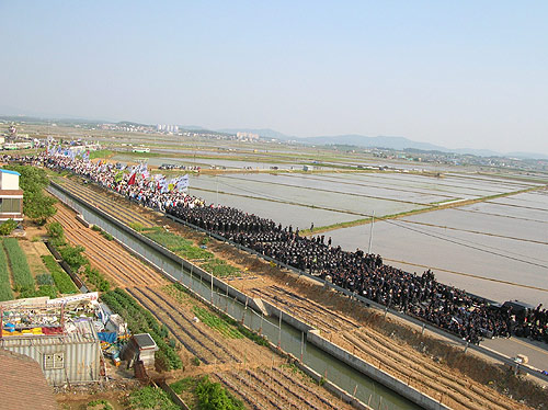[ÆÛ¿È-¹ÎÁßÀÇ ¼Ò¸®] ¿ÀÀü 6½Ã 30ºÐ ÇöÀç, õ¿©¸íÀÇ ¹ÎÁÖ³ëÃÑ Á¶ÇÕ¿øµé°ú ´ëÇлý, ½Ã¹Î»çȸ´Üü ȸ¿øµéÀº Àü³¯ È«ÀÍ´ëÇб³¿¡¼ ¹ãÀ» »õ¿ì°í À̳¯ »õº® 6½Ã°æ ÆòÅÃ ÆØ¼ºÀ¾ º»Á¤¸®¿¡¼ 2km °¡·® ¶³¾îÁø Ãæ³² µÐÆ÷¿¡ µµÂøÇØ 30¿©ºÐ°£ ´ë±âÇÏ´Ù°¡ 6½Ã ¹Ý°æºÎÅÍ º»Á¤¸® ¹æÇâÀ¸·Î À̵¿À» ½ÃÀÛÇß´Ù. À̵éÀÇ ¸Ó¸® À§·Î´Â °æÂû Ç︮ÄßÅͰ¡ ºÒ°ú 30¹ÌÅÍ ³ôÀÌ¿¡¼ À§ÇùÀûÀ¸·Î Àú°øºñÇàÁßÀÌ´Ù.