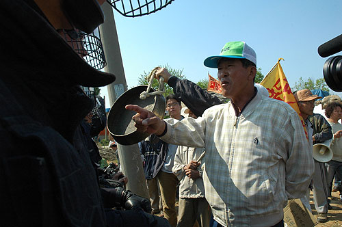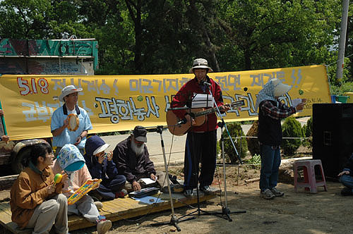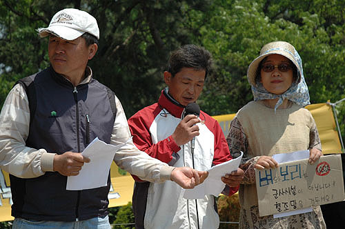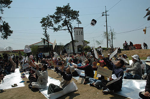 ÆòÅÃÁÖ¹ÎÀ» ´ëÇ¥ÇØ ¹«´ëÀ§·Î ¿Ã¶ó¿Â ¼ÛÀç±¹(69¼¼)¾¾´Â "±ºÀεéÀÌ 285¸¸ÆòÀÇ ¶¥¿¡ öÁ¶¸ÁÀ» µÑ·¯ ±º»ç½Ã¼³À̶ó Çϰí ħ¹üÇϸé ó¹úÇϰڴٰí ÇÔÁ¤À» ÆÄ°í ÀÖ´Ù"¸ç ¿ïºÐÀ» Åä·ÎÇßÀ¸¸ç ¹ß¾ð µÚ ¸¶À» ÁֹεéÀÌ Ã¶Á¶¸ÁÀÌ ±×·ÁÁø Æîħ¸·À» Âõ´Â »ó¡ÀǽÄÀÌ ÁøÇàµÆ´Ù. ¼ÛÀç±¹ ¾¾ µî ¸¶À» ÁֹεéÀº ¹Ù±¸´Ï ÇÑ °¡µæ ÆòÅÃÀÇ º±¾¾¸¦ µé°í ¿Í 5000¿© ÃкÒÇà»ç Âü°¡Àڵ鿡°Ô ³ª´²ÁÖ¸ç "µé³è¿¡ Èñ¸ÁÀÇ º±¾¾¸¦ »Ñ¸®ÀÚ"°í È£¼ÒÇß´Ù.