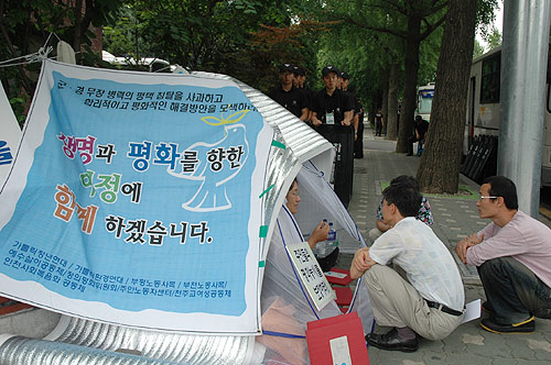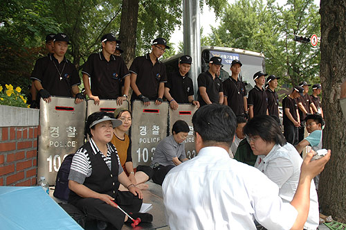 ¡ãÁöÁö¹æ¹®À» °£ ÆòÅë»ç º¯¿¬½Ä °øµ¿´ëÇ¥, õÁ¤¿¬ ¹Ú¼øÈñ ´ëÇ¥ µîÀ» °æÂûµéÀÌ ÀÔ±¸¿¡¼ ¸·°í ÃâÀÔÀ» ¸øÇÏ°Ô Çϰí ÀÖ´Ù. À̵éÀº ¼¿ï°æÂûû¼Ò¼Ó 202°æºñ´ë ¹ÚÇѰ氨¿Ü 10¿©¸íÀÇ »çº¹°æÂûÀÌ´Ù.