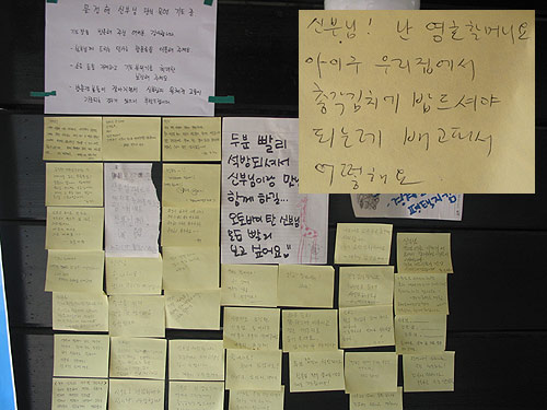 ¹æ¹®°´µéÀº ½ÅºÎ´ÔÀ» ÀÀ¿øÇÏ´Â ÂÊÁö¸¦ ½á¼ ÇÑÂÊ º®¿¡ ºÙ¿© ³ª°¡°í ÀÖ½À´Ï´Ù. ¾ü±×Á¦ ÆØ¼º ¾î¸Ó´ÔµéÀÌ ºÙ¿© ³õÀº ÂÊÁöµéµµ º¸ÀÔ´Ï´Ù. "½ÅºÎ´Ô! ³ ¿µÈ£ ÇÒ¸Ó´Ï¿ä. ¾ÆÀ̱¸, ¿ì¸®Áý¿¡¼ ÃѰ¢±èÄ¡¿¡ ¹äµå¼Å¾ß µÇ´Â µ¥ ¹è°íÆÄ¼ ¾î¶±ÇØ¿ä"