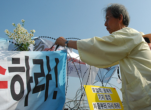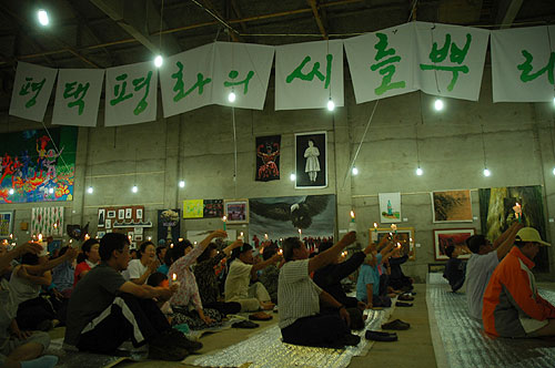 ÇÑÆí, µµµÎ2¸®¿¡ ¸ðÀÎ ´ë¿À´Â öÁ¶¸Á¿¡ ¼ÒÁöõÀ» °É¸ç '±ººÎ´ë ö¼öÇÏ°í Æòȳó»ç ÁþÀÚ!' 'ÆòÅù̱º±âÁöÈ®Àå Àü¸é ÀçÇù»ó Ç϶ó!'´Â ±¸È£¸¦ ¿ÜÄ¡¸ç ÆòÈÀûÀ¸·Î Àΰ£¶ìÀÕ±â Çà»ç¸¦ ÁøÇàÇϰí ÀÖ½À´Ï´Ù. Àΰ£¶ìÀÕ±â Çà»ç¿¡ Âü¿©ÇÑ Âü°¡ÀÚµéÀº ´ëÃ߸® º»´ë¿À¿Í ¸¸³ª±â À§ÇØ °è¼ÓÇØ¼ ÁøÀÔÀ» ½ÃµµÁßÀÔ´Ï´Ù.
