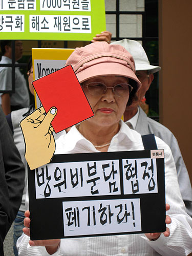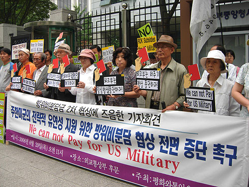 ¸ÕÀú ±èÆÇÅ ÆòȱºÃàÆÀÀåÀº ¡°ÁÖÇѹ̱º ¹æÀ§ºñºÐ´ã±ÝÀº ¹Ì±ºÀÇ ¸ðµç ¿î¿µºñ¸¦ ¹Ì±¹ÀÌ ºÎ´ãÇϵµ·Ï ÇÑ ÇÑ¹Ì¼ÒÆÄÀÇ ±ÔÁ¤¿¡µµ Á¤¸éÀ¸·Î ¾î±ß³ª´Â ºÒ¹ý°ú Æí¹ýÀ» ¶Ç´Ù½Ã µÇÇ®ÀÌÇÏ´Â °ÍÀÌÀÚ, ÁÖÇѹ̱ºÀÇ ¾Æ½Ã¾ÆÅÂÆò¾ç±âµ¿±ºÀ¸·ÎÀÇ Àüȯ Áï ħ·«±ºÈ¸¦ ¿ì¸® ±¹¹ÎÀÇ Ç÷¼¼·Î µÞ¹ÞħÇÏ·Á´Â °ÍÀ̱⿡ ¿ì¸®´Â Ä¿´Ù¶õ ºÐ³ë¸¦ ´À³¢Áö ¾ÊÀ» ¼ö ¾ø´Ù¡±¸ç, ÀÌ¿¡ ¡°¹æÀ§ºñºÐ´ã±Ý Çù»óÀÇ ºÎ´ç¼ºÀ» ±¹¹Îµé¿¡°Ô ¾Ë¸®°í Á¤ºÎ¿¡°Ô´Â Çù»óÀÇ Àü¸é Áß´Ü Ã˱¸Çϱâ À§ÇØ ±âÀÚȸ°ßÀ» ¿°ÔµÇ¾ú´Ù¡±´Â ÃëÁö ¹ß¾ðÀ» ÇÏ¿´´Ù.