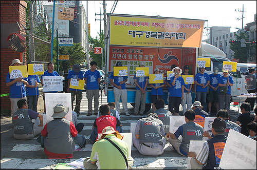 ¿ÀÈÄ 4½Ã. ´ë±¸ Ä·ÇÁ ¿öÅ© ÈĹ®¿¡¼´Â '±¼¿åÀû Çѹ̵¿¸Í ÇØÃ¼, ÁÖÇѹ̱º ö°Å, ÇÑ¹Ì FTA ÀúÁö ´ë±¸°æºÏ °áÀÇ´ëȸ'°¡ 200¿©¸íÀÇ Çлý, ³ëµ¿ÀÚ, ޹æ´Ü µîÀÌ Âü°¡ÇÑ °¡¿îµ¥ ¿·È´Ù. ¿À´ÃÀº 7¿ù 27ÀÏ Çѱ¹ÀüÀï ÈÄ Á¤ÀüÇùÁ¤ÀÌ Ã¼°áµÈ ³¯ÀÌ´Ù. À̳¯ Áýȸ´Â ÇϷ绡¸® ÆòÈÇùÁ¤À» ü°áÇØ Çѹݵµ¿¡ Æòȸ¦ Á¤Âø½Ãų °ÍÀ» °áÀÇÇÏ´Â ÀÚ¸®¿´´Ù.