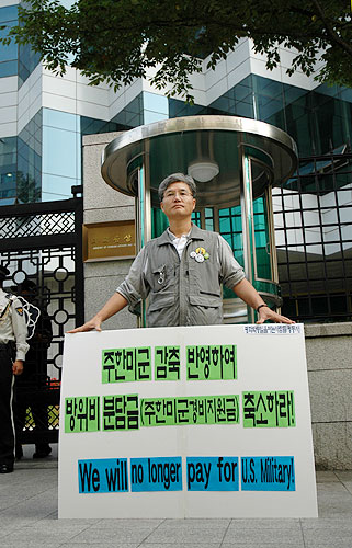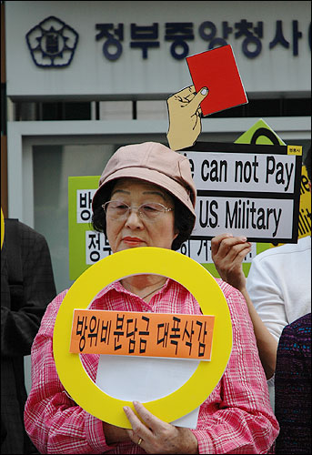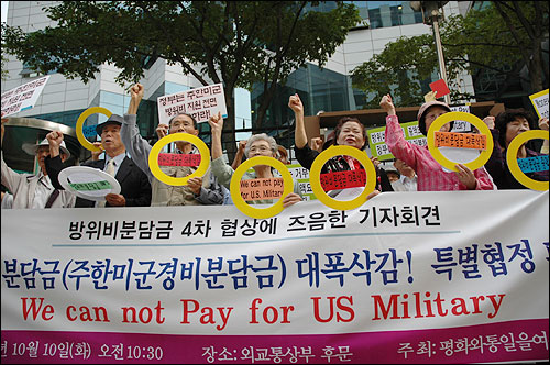 ÆòÅë»ç´Â ±âÀÚȸ°ß¹®À» ÅëÇØ ¡°Æ¯º°ÇùÁ¤À» ü°áÇϸ鼱îÁö Áֵй̱º¿¡ ´ëÇÑ °æºñ¸¦ Áö¿øÇÏ´Â ³ª¶ó´Â ¼¼°è¿¡¼ ¿ì¸®³ª¶ó¿Í ÀϺ» µÎ ³ª¶ó»ÓÀÌ¸ç ¿ì¸®³ª¶ó¿Í ÀϺ»ÀÌ ºÎ´ãÇÏ´Â Áֵй̱º Áö¿ø°æºñ°¡ Àü ¼¼°è ¹Ì±º Áֵб¹ÀÌ ¹Ì±¹¿¡ Áö¿øÇÏ´Â °æºñÀÇ 90%(Á÷Á¢ºñ)¸¦ Â÷ÁöÇÒ Á¤µµ¡±¶ó°í Æø·ÎÇÏ¸ç ¡°±×·±µ¥µµ ¹Ì±¹Àº ÀÓ´ë·á Áö¿ø Æò°¡¸¦ ³·Ãß°í KATUSA °ü·Ã ºñ¿ëÀ» Á¦¿ÜÇÏ´Â µî ¿ì¸®ÀÇ Á÷, °£Á¢Áö¿øÀ» Á¤´çÇÏ°Ô Æò°¡ÇÏÁö ¾ÊÀ¸¸é¼ ÀϺ»°ú ºñ±³Çϸç 75% ÀÌ»ó Áö¿øÇØ¾ß ÇÑ´Ù¡±°í ¿ì¸® Á¤ºÎ¿Í ±¹¹ÎµéÀ» Çù¹ÚÇϰí ÀÖ´Ù°í ²¿Áý¾ú´Ù.