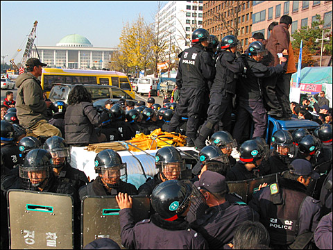 ¡â ÁֹεéÀÌ ³ó¼º¹°Ç°À» ½Æ°í ¿Â Æ®·°À» Àü°æµéÀÌ ¿¡¿ö½Î°í ÀÖ¾î õ¸·À» Ä¡·Á´Â Áֹεé°ú »çȸ´Üü ȸ¿øµé°£¿¡ ½ÉÇÑ ¸ö½Î¿òÀÌ ¹ú¾îÁ³´Ù. ±¹¹ÎµéÀÇ °íÅëÀ» ¾Æ´Â Áö ¸ð¸£´Â Áö ¹«½ÉÇϰԸ¸ º¸ÀÌ´Â ±¹È¸¸¦ µÚ·Î Çϰí Áֹεé°ú Àü°æµéÀÌ ´ëÄ¡Çϰí ÀÖ´Ù.