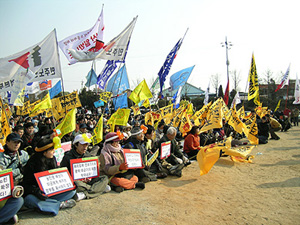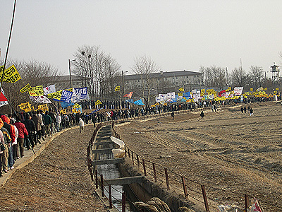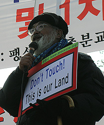 °æ±â¹Îû dz¹°ÆÐ°¡ Áֹεé°ú ÇÔ²² ¶Ú ½Å¸í³ª´Â ±æ³îÀ̰¡ ³¡³ ÈÄ Æòȹٶ÷ ´ëÇ¥ÀÌÀÚ ´ëÃ߸® ÁÖ¹ÎÀÎ ¹®Á¤Çö ½ÅºÎ°¡ "Don't touch! This is our land!(°Çµå¸®Áö ¸¶¶ó! ¿©±ä ¿ì¸® ¶¥ÀÌ´Ù!)"¶ó°í ¾ºÀÎ ÇÇÄÏÀ» µé°í ´Ü»ó¿¡ ¿Ã¶ú´Ù. "¿À´ÃÀ» ¸¹ÀÌ ±â´Ù·È´Ù. ÀÌ °÷À¸·Î ÀÌ»ç¿Â Áö 20ÀÏ Á¤µµ µÆ´Âµ¥, ±× µ¿¾È ÅäÁöÁ¶»ç¿Í °Ç¹°Á¶»ç¸¦ ÇÑ´Ù¸ç ±¹¹æºÎ, ÅäÁö°ø»ç, ÁÖÅðø»ç, Çѱ¹°¨Á¤¿ø µî¿¡¼ ÆØ¼º¶¥À» ħÅõÇßÁö¸¸ ÁֹεéÀº Á×À½À» °á»çÇÏ°í ¸·¾Æ³Â´Ù. Â÷·Î µé¾î¿À¸é Æ®·°À¸·Î µû¶ó°¡°í, ¹è·Î µé¾î¿À¸é ¹è¸¦ Ÿ°í ÂѾư¡¼ ¸·¾Ò´Âµ¥, Çï±â¸¦ Ÿ°í ³ªÅ¸³ª »çÁøÀ» ÂïÀ¸´Ï ¹ÌÄ¡°í ȯÀåÇϰڴõ¶ó...»õÃÑÀÌ¶óµµ ÀÖÀ¸¸é ¸ÂÇô ¶³¾î¶ß¸®°í ½Í´õ¶ó"¸ç ¾ÈŸ±î¿î ½ÉÁ¤À» ÀüÇß´Ù. ¹ü´ëÀ§°¡ Ãâ¹üÇÏ´Â ¿À´ÃÀ» "¹Ý¹Ì¿¬ÇÕ¼¼·Â°ú Ä£¹ÌÁ¤ºÎ¼¼·Â°úÀÇ ½Î¿òÀÌ ½ÃÀÛµÈ ³¯"À̶ó°í ¼±Æ÷ÇÑ ¹® ½ÅºÎ´Â "¿©±â¼ ½Â¸®ÇÏ¸é »õ·Î¿î ÀÚÁÖ¿Í »ý¸íÀÇ ÀåÀ» ¿°Ô µÉ °Í"À̶ó¸ç "»ý¸íÀÇ ¶¥À» ¹«±â¸¦ ½É´Â Á×À½ÀÇ ¶¥À¸·Î ¸¸µéÁö ¸øÇϵµ·Ï ÀںνÉÀ» °¡Áö°í »õ ÁöÆòÀ» ¿ °¢¿À·Î ÅõÀï¿¡ ÀÓÇÏÀÚ"°í Âü¼®ÀÚµéÀ» °Ý·ÁÇß´Ù.