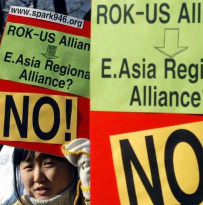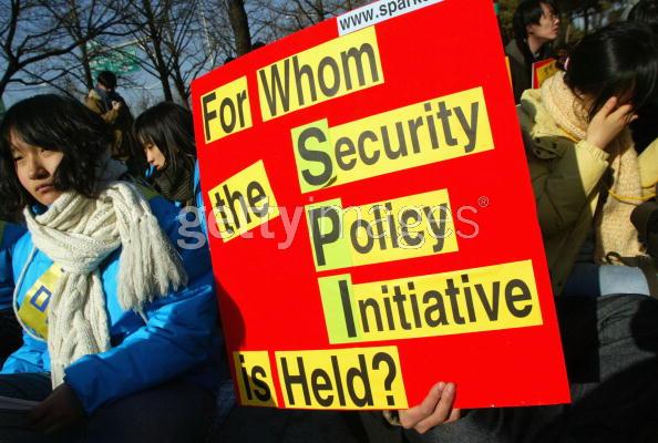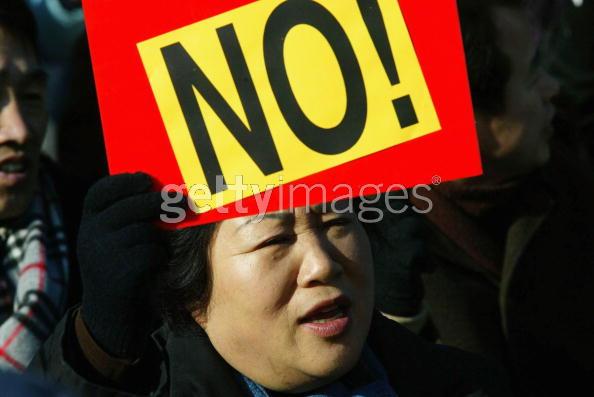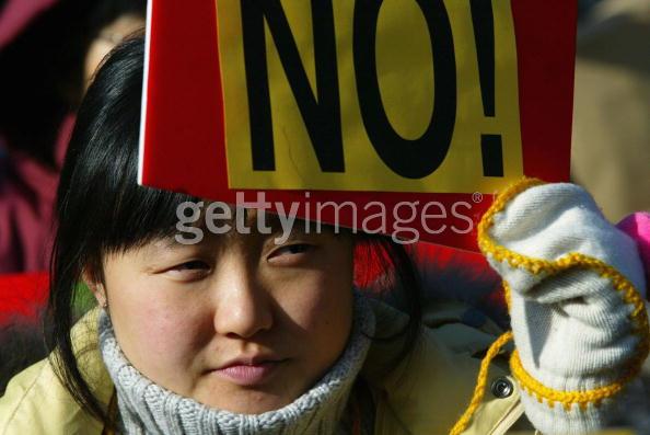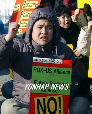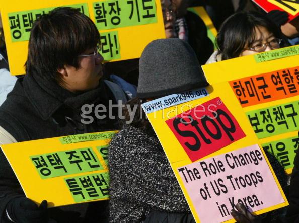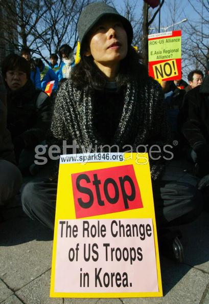 SEOUL, SOUTH KOREA - JANUARY 11: South Korean activists hold anti-US placards at a rally near the U.S. embassy on January 11, 2005 in Seoul, South Korea. Protesters rallied near the embassy to demand the South Korean and U.S. Security Policy Initiative (SPI) meeting, and demanded that the U.S. cancel its plan to relocate its troops to Pyongtaek, south of Seoul, and instead withdraw its troops from South Korea. (Photo by Chung Sung-Jun/Getty Images)
