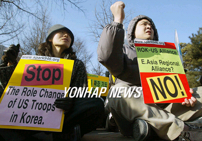 South Korean pacifists shout slogans near the U.S. Embassy in Seoul, South Korea, Tuesday, Jan. 11, 2005, opposing the relocation of U.S. troops from Seoul to Pyeongtaek, 70 kilometers (40 miles) south of Seoul. The United States will move all of its troops out of metropolitan Seoul as part of a global realignment to make U.S. forces more nimble and technology-driven. (AP Photo/ Lee Jin-man)