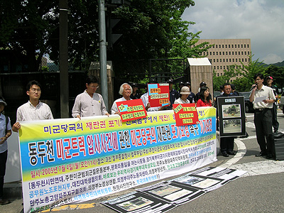 7¿ù 4ÀÏ ¿ÀÀü 11½Ã ¹ý¹«ºÎ °úõÁ¾ÇÕû»ç ¾Õ¿¡¼ µ¿µÎõ ¹Ì±ºÆ®·° ¾Ð»ç»ç°Ç¿¡ °üÇÑ ¹Ì±º´ç±¹ÀÇ ÀçÆÇ±Ç Æ÷±â ¿äûÀ» ¹ý¹«ºÎ¿¡ Ã˱¸ÇÏ´Â ±âÀÚȸ°ßÀÌ ¡®ÁÖÇѹ̱º ´ëÇüÆ®·°¿¡ ÀÇÇÑ ¾Ð»ç»ç°Ç Áø»ó±Ô¸íÅõÀï ºñ»ó´ëÃ¥À§¿øÈ¸¡¯(ÀÌÇÏ ºñ´ëÀ§) °ü·Ã ´Üü(µ¿µÎõ½Ã¹Î¿¬´ë, Áֹ̺», ÆòÅë»ç µî) ȸ¿ø 10¿©¸íÀÌ Âü°¡ÇÑ °¡¿îµ¥ ¿·È´Ù.