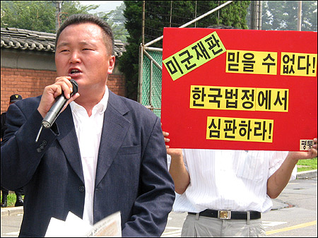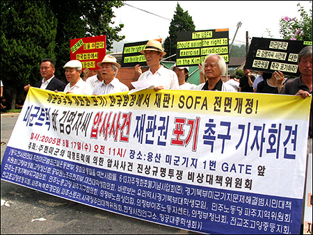 8¿ù 18ÀÏ ¿ÀÀü 11½Ã ¿ë»ê ¹Ì±º±âÁö 1¹ø °ÔÀÌÆ® ¾Õ¿¡¼´Â Áö³ 6¿ù µ¿µÎõ¿¡¼ ¹Ì±ºÀÇ Æ®·°¿¡ ÀÇÇØ ¾Ð»ç´çÇÑ Íº ±è¸íÀÚ¾¾ »ç°Ç¿¡ ´ëÇØ ¹Ì±ºÃøÀÌ ÀçÆÇ±ÇÀ» Æ÷±âÇÏ°í °¡ÇØ ¹Ì±ºÀ» Çѱ¹ ¹ýÁ¤¿¡ ¼¼¿ö ÁËÀÇ ½Ã½Ãºñºñ¸¦ °¡¸± °ÍÀ» Ã˱¸ÇÏ´Â ±âÀÚȸ°ßÀÌ ¿·È½À´Ï´Ù.