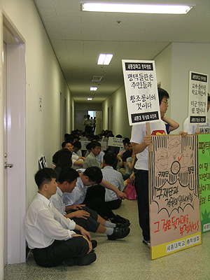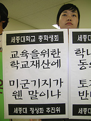 ÆòÅà ¹Ì±º±âÁö È®ÀåÀ» À§ÇÑ ´ë¾çÇпø ºÎÁö ¸Å°¢À» ¹Ý´ëÇÏ´Â Áýȸ¿Í ¸Å°¢¿©ºÎ¸¦ °áÁ¤Çϱâ À§ÇØ ¿¸®´Â ¼¼Á¾´ëÇб³ ´ë¾çÇпø ÀÌ»çȸ¸¦ ¸·±â À§ÇÑ ÅõÀïÀÌ ¿À´Ã ¿ÀÀü 8½Ã ºÎÅÍ ¼¼Á¾´ëÇб³¿¡¼ °è¼ÓµÇ°í ÀÖ½À´Ï´Ù.