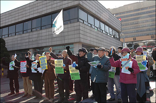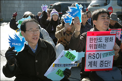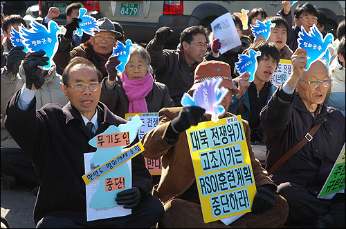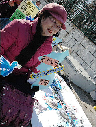 Âü°¡ÀÚµéÀº ¡°°ø°Ý¹«±âü°è µµÀÔ ¹Ý´ëÇÑ´Ù!¡±, ¡°Çѹݵµ ÆòÈüÁ¦ ½ÇÇöÇÏÀÚ¡±, ¡°¹æÀ§ºñºÐ´ã±Ý Æó±âÇ϶ó!¡±´Â ±¸È£¸¦ ¿ÜÄ¡¸ç ±¹¹æºÎ Á¤¹® ¾ÕÀ¸·Î À̵¿ÇÏ¿´´Ù.