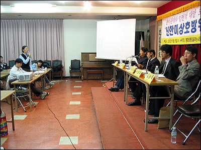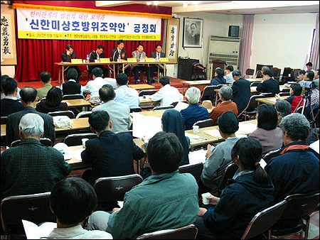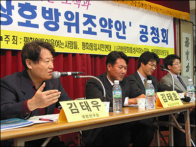 ¡ã 50³â Çѹ̵¿¸ÍÀÇ Á¦µµÀû ±âÃʸ¦ ÀÌ·ç¾î¿Â ÇöÇà Çѹ̻óÈ£¹æÀ§Á¶¾àÀ» Àü¸éÀûÀ¸·Î °³Á¤ÇÑ '½ÅÇѹ̻óÈ£¹æÀ§Á¶¾à¾È'À» Á¦½ÃÇÏ°í ±×¿¡ °üÇÑ °¢°è°¢ÃþÀÇ ÀǰßÀ» ¸ðÀ¸±â À§ÇÑ °øÃ»È¸°¡ 15ÀÏ ¿ÀÈÄ 2½Ã Èï»ç´Ü °´ç¿¡¼ ÆòÈ¿ÍÅëÀÏÀ»¿©´Â»ç¶÷µé, ÆòÈÅëÀϽùο¬´ë, ¹ÝÀüÆòÈÀÇ¿ø¸ðÀÓ, ³ª¶ó¿Í ¹®È¸¦ »ý°¢ÇÏ´Â ¸ðÀÓ ÁÖÃÖ·Î ¿·È´Ù. [»çÁø - ÆòÈ¿ÍÅëÀÏÀ»¿©´Â»ç¶÷µé]