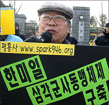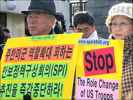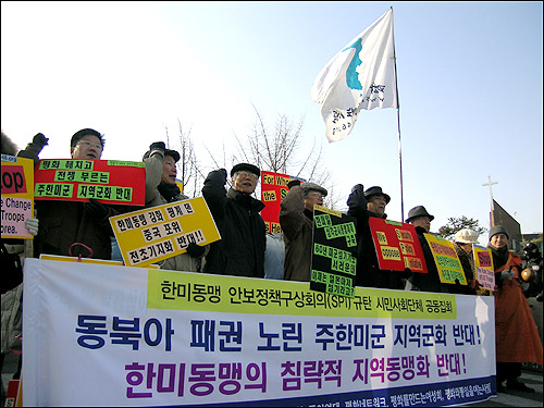 Çѹ̾籹ÀÇ Ã¹ ¾Èº¸Á¤Ã¥±¸»ó(SPI) ȸÀǰ¡ ¿¸®´Â 3ÀÏ ¿ÀÀü 10½Ã, ±¹¹æºÎ ¾Õ¿¡¼´Â ÅëÀÏ¿¬´ë, ÆòÈ³×Æ®¿öÅ©, Æòȸ¦ ¸¸µå´Â ¿©¼ºÈ¸, ÆòÈ¿Í ÅëÀÏÀ» ¿©´Â »ç¶÷µé µî ½Ã¹Î»çȸ´ÜüµéÀÌ 'µ¿ºÏ¾Æ ÆÐ±Ç³ë¸° ÁÖÇѹ̱º Áö¿ª±ºÈ ¹Ý´ë!, Çѹ̵¿¸ÍÀÇ Ä§·«Àû Áö¿ªµ¿¸ÍÈ ¹Ý´ë!¡®¶ó´Â ÁÖÁ¦·Î SPI ±Ôź Áýȸ¸¦ ¿¾ú´Ù.