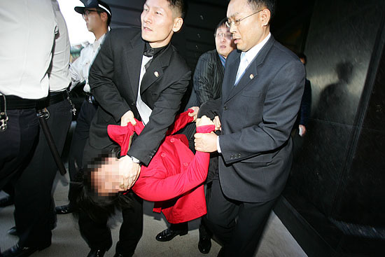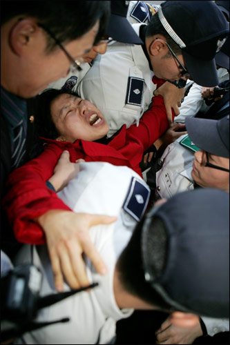 ±èÆÇÅÂ, À¯Á¤¼· µÎ ȸ¿øÀÌ °æÂûÀÇ Á¦Áö¸¦ ¹Þ´Â ¼ø°£ À¯ÇѰæ(¿©¼º) ȸ¿øÀÌ 'No! SCM', 'Get Out Robert Gates', 'Returne OPCON Right Now'¶ó°í ÀûÈù Ç÷£Ä«µå¸¦ ÆîÃÄ µé°í ±¸È£¸¦ ¿ÜÃÆÀ¸¸ç, ÀÌ ¿©¼º ȸ¿ø ¿ª½Ã ³²¼º °æÂûµé¿¡°Ô ¸Ó¸®Ã¤¸¦ ÈÖ¾î ÀâÈ÷°í, ¸ñÀÌ Á¹·ÈÀ¸¸ç, ¹Ù´Ú¿¡ ³Ñ¾îÁ® ¼Õ¸ñÀÌ ²©ÀÌ´Â ¹«ÀÚºñÇÑ Æø·Â Á¦Áö¸¦ ´çÇß½À´Ï´Ù. »çÁö°¡ µé¸°Ã¤ ²ø·Á³ª°¡´Â µ¿¾È ÀÌ ¿©¼º ȸ¿øÀº ÀÛÀüÅëÁ¦±Ç ¿ÂÀüÈ÷ ȯ¼öÇ϶ó´Â µîÀÇ ±¸È£¸¦ ¿ÜÄ¡¸ç ¿Ï°È÷ ÀúÇ×ÇÏ¿´À¸³ª ³²¼º °æÂûµé¿¡ ÀÇÇØ ÀÔÀ» Ʋ¾î ¸·È÷°í, ¸ñÀÌ ²©ÀΠä »çÁö°¡ ÁúÁú ²ø¸° ä È£ÅÚ ¹ÛÀ¸·Î ²ø·Á ³ª°¬½À´Ï´Ù.