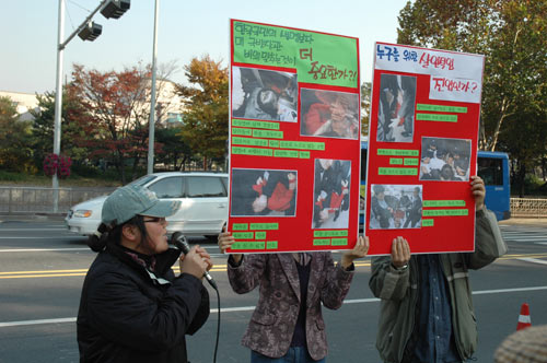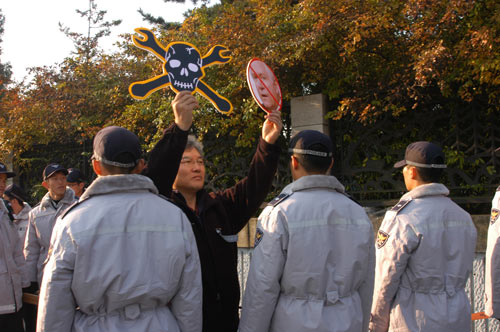 ÇÇÄÏÀ» ³ôÀ̵é°í ±¸È£¸¦ ¿ÜÄ¡´Â µî Ç×ÀǼÇÑ Àü´Þ¿¡ ´ëÇÑ Âü°¡ÀÚµéÀÇ Ç×ÀÇÇൿÀÌ À̾îÁöÀÚ °æÂûµéÀÌ °ã°ãÀÌ ¸·¾Æ¼¹½À´Ï´Ù. ±âÀÚȸ°ß¿¡ Âü°¡ÀÚ Áß ÇѸíÀÌ "±¼¿åÀûÀÎ Çù»ó¿¡ ´ëÇØ¼ Ȱ¡ ³ªÁöµµ ¾Ê´À³Ä"´Â Ç×ÀÇ¿¡ µÚÂÊ¿¡ ÀÖ´ø Çü»ç ÇѸíÀº "±×·± ¸»Àº ´ç½Åµé³¢¸®³ª ÇØ¶ó" ¶ó¸ç "¹«Á¶°Ç »©³»"¶ó´Â Áö½Ã¸¦ Çϱ⵵ Çß½À´Ï´Ù. µéÀ¸·Á ÇÏÁöµµ ¾Ê°í º¸·Á°íµµ ÇÏÁö ¾Ê´Â ŵµ´Â ±¹¹æºÎ °íÀ§ ´çÁ÷ÀÚ³ª °æÂûÀ̳ª ¸Å ÇѰ¡ÁöÀÔ´Ï´Ù. °á±¹ Ç×ÀǼÇÑÀº Àü´ÞÇÏÁö ¸øÇϰí Ç×Àdzó¼ºÀ» À§ÇØ ±¹¹æºÎ ¹Î¿ø½Ç ¾ÕÀ¸·Î À̵¿ÇÏ¿´½À´Ï´Ù.