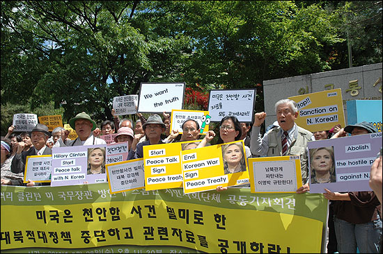 Èú·¯¸® Ŭ¸°ÅÏ ¹Ì ±¹¹«Àå°üÀÌ 26ÀÏ ¹æÇÑÇÏ¿© À̸í¹Ú ´ëÅë·É°ú À¯¸íȯ ¿Ü±³Åë»óºÎ Àå°üÀ» ¸¸³ª õ¾ÈÇÔ ÈÄ¼Ó ´ëÃ¥ µîÀ» ³íÀÇÇß½À´Ï´Ù. ÀÌ¿¡ ÆòÈ¿Í ÅëÀÏÀ» ¿©´Â »ç¶÷µéÀ» ºñ·ÔÇÑ »çȸ´Üü´Â 1½Ã30ºÐ ¿Ü±³Åë»óºÎ Á¤¹® ¾Õ¿¡¼ ¡®¹Ì±¹Àº õ¾ÈÇÔ »ç°Ç ºô¹Ì·Î ÇÑ ´ëºÏ Àû´ëÁ¤Ã¥ Áß´ÜÇÏ°í °ü·Ã ÀڷḦ °ø°³Ç϶ó!¡¯ ´Â ÁÖÁ¦·Î ±âÀÚȸ°ßÀ» ÁøÇàÇÏ¿´½À´Ï´Ù.