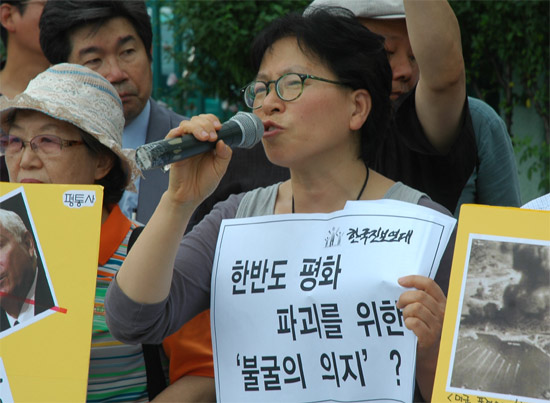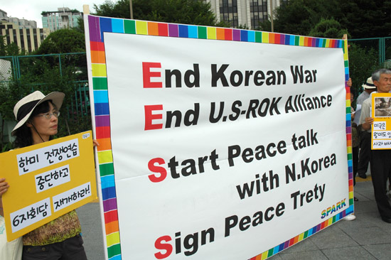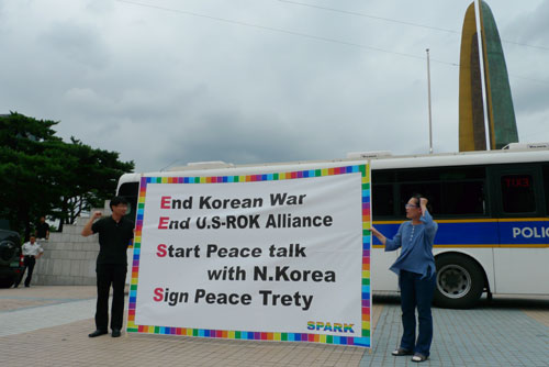 ¿Ü±³Åë»óºÎ¿Í Á¤ºÎÁ¾ÇÕû»ç¸¦ ¿¬°áÇÏ´Â ±¸¸§´Ù¸®¸¦ ÅëÇØ Ŭ¸°ÅÏ Çѹܱ̿³Àå°ü ÀÏÇàÀÌ Áö³ª°¡ÀÚ ¡°No Sanction! , Peace treaty now! µî ¿ì¸®ÀÇ ¿ä±¸¸¦ ÈûÂ÷°Ô ¿ÜÃÆ½À´Ï´Ù.