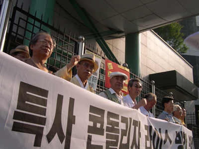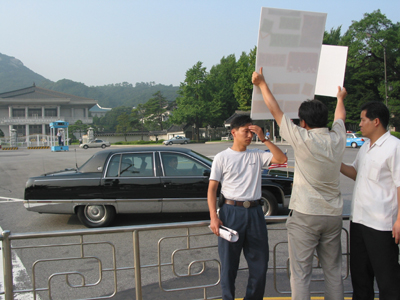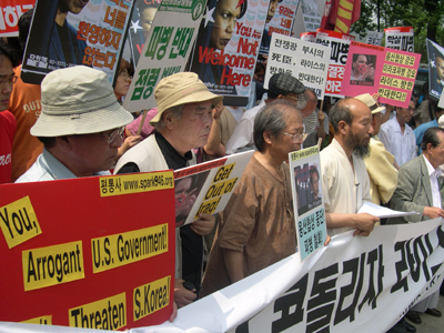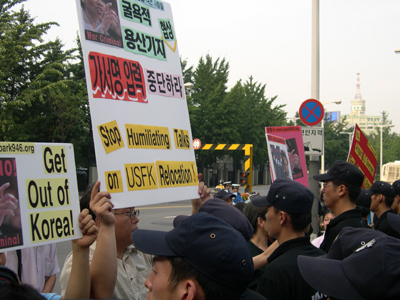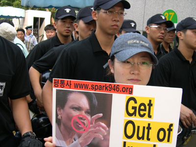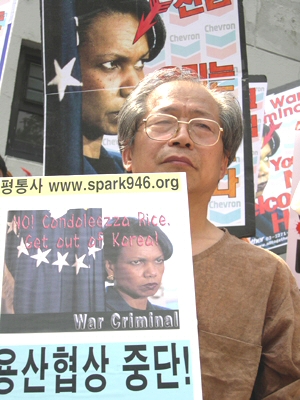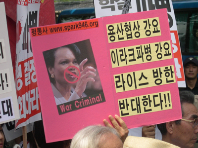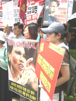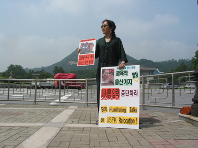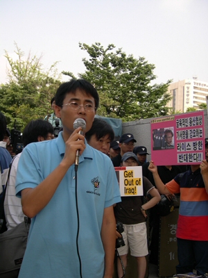 ¿ÀÈÄ 5½Ã 30ºÐ°æ Á¤ºÎÁß¾Óû»ç Á¤¹® ¾Õ¿¡¼ 1ÀνÃÀ§¸¦ ÇÏ´ø ÆòÅë»ç À¯¿µÀç ÆÀÀåÀº Áö³ª°¡´Â ¶óÀ̽º º¸Á°üÀ» ÇâÇØ "Get out of Iraq!", "Get out of Korea!"¶ó´Â ±¸È£¸¦ ¿ÜÄ¡¸ç ¹æÇÑÀ» ±ÔźÇß°í..