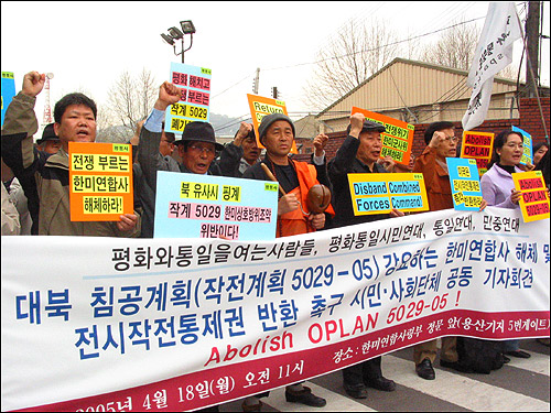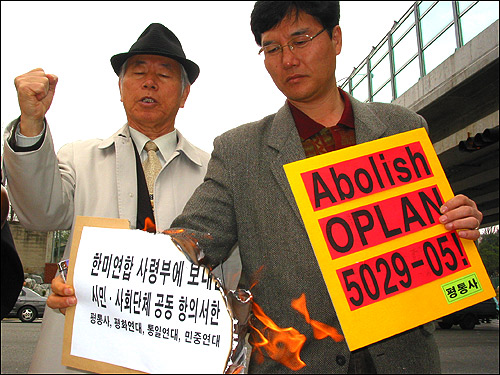 ¡®ÀÛÀü°èȹ 5029-05¡¯´Â 99³âµµ¿¡ ¸¶·ÃµÈ °³³ä°èȹ '5029-99'¸¦ ±¸Ã¼ÈÇÑ °ÍÀ¸·Î, ¹Ì±¹ÀÇ ´ëºÏ¼±Á¦°ø°Ý °èȹÀÌ ±¸»ó´Ü°è¸¦ ³Ñ¾î º»°ÝÀûÀÎ ½ÇÇà´Ü°è·Î Á¢¾îµé°í ÀÖÀ½À» º¸¿©ÁØ´Ù. ÀÌ¿¡ Âü°¡ÀÚµéÀº "¹Ì±¹ÀÇ À§Çèõ¸¸ÇÑ ´ëºÏħ°ø°èȹÀ» ÀúÁöÇϰí ÇѹݵµÀÇ ÆòÈ¿Í ¾ÈÁ¤À» À§Çؼ´Â 'ÀÛÀü°èȹ 5029'ÀÇ Æó±â¸¸ÀÌ ¾Æ´Ï¶ó ¹Ì±¹ÀÇ ´ëºÏ¼±Á¦°ø°Ý°èȹÀÌ ¹Ý¿µµÈ ¡®ÀÛÀü°èȹ 5026¡¯, ¡®ÀÛÀü°èȹ 5027¡¯ µî ÀÏüÀÇ Çѹݵµ ÀÛÀü°èȹÀ» Æó±âÇØ¾ß ÇÑ´Ù"°í ÁÖÀåÇß´Ù.