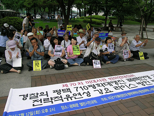 710 ÆòÈ´ëÇàÁøÀÇ ³ë°í°¡ ä Ç®¸®Áöµµ ¾ÊÀº 12ÀÏ ¿ÀÈÄ 2½Ã, ±×Á¦ÀÇ ±× ¾ó±¼µéÀÌ ¹Ì´ë»ç°ü ¾Õ ¿¸°½Ã¹Î°ø¿ø¿¡ ¸ð¿´´Ù. Âü°¡ÀÚµéÀº 710 ÆòÈ´ëÇàÁøÀÇ ¼Ò°¨À» ³ª´©¸ç ¼·ÎÀÇ ¾ÈºÎ¸¦ ¹¯´Â µî ÀÌÀüº¸´Ù ÈξÀ ´õ ²ö²öÇØÁø µ¿Áú°¨À» ¼û±âÁö ¾Ê¾Ò´Ù.