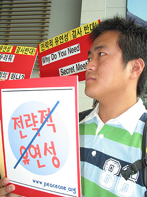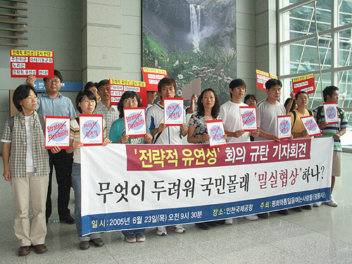 ÇÑÆí, ¿Ü±³Åë»óºÎ´Â Àü·«Àû À¯¿¬¼º ȸÀǸ¦ öÀúÈ÷ ºñ¹Ð·Î ÇØ '±¹¹Î ´«À» ¼ÓÀÌ´Â ¹Ð½ÇÇù»ó'À̶ó´Â ºñ³À» ¹Þ°í ÀÖ´Ù. ÆòÅë»ç´Â '¹Ð½ÇÇù»ó'¿¡ ´ëÇØ "¹Ì±¹ÀÇ ¿ä±¸°¡ ¿ö³« ºÎ´çÇÏ°í ¹ÎÁ·ÀÇ ÀÌÀÍÀ» Ä§ÇØÇÏ´Â °ÍÀÌ¾î¼ ±¹¹ÎÀû °ø·ÐȰúÁ¤À» ÅëÇØ¼´Â Á¤´ç¼º°ú ÇÕ¹ý¼ºÀ» È®º¸ÇÒ ¼ö ¾ø±â ¶§¹®"À̶ó°í ²¿Áý¾ú´Ù.
