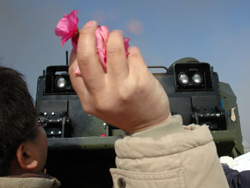 ¡ã°øÆ÷źÀÌ ½ñ¾ÆÁö°í ÇØº¯¿¡¼ ¸ðÀÇ ÆøÅºÀÌ ÅÍÁö´Â ¼Ó¿¡¼ ¼ö·ú¾ç¿ë Àå°©Â÷°¡ ÇØº¯°¡·Î º´·Â°ú Àåºñ¸¦ ³»·Á³õÀ¸¸é¼ ÇѹÌÀüÀ↓½ÀÀÌ ½ÃÀ۵Ǿú°í ¹Ù·Î ÀÌ ¾Õ¿¡¼ ±âÀÚȸ°ßÀÌ ÁøÇàµÇ¾ú´Ù. Âü°¡ÀÚµéÀº Æòȸ¦ »ó¡ÇÏ´Â ²É°ú ºñµÑ±â ¸ð¾çÀÇ Á¾À̸¦ Àå°©Â÷¿¡ ´øÁö¸ç ÆòÈÀÇ ¸Þ¼¼Áö¸¦ Àü´ÞÇß´Ù.
