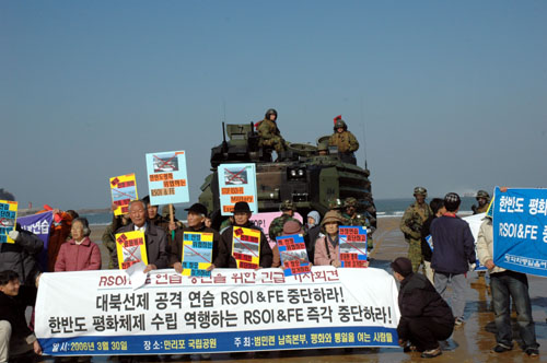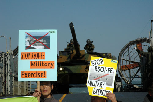 »ó·úÈÆ·ÃÀÌ ÁߴܵÇÀÚ ÇãµÕÁöµÕ ´çȲÇÑ ¹Ì±ºµéÀº ±âÀÚȸ°ß Âü°¡ÀÚµéÀ» ¹Ð¾îºÎÄ¡´Â µî ÇàÆÐ¸¦ ºÎ·ÈÀ¸³ª ±âÀÚȸ°ß Âü°¡ÀÚµéÀº "Stop Military Exercise !", "Stop RSOI&FE !"¸¦ ¿ÜÄ¡¸ç ¹Ì±ºµéÀ» ¹°¸®Ä¡´Â µî RSOI&FE ¿¬½À¿¡ Ç×ÀÇÇÏ´Â °á¿¬ÇÑ ÅõÀïÀÇÁö¸¦ º¸¿©ÁÖ¾ú´Ù.