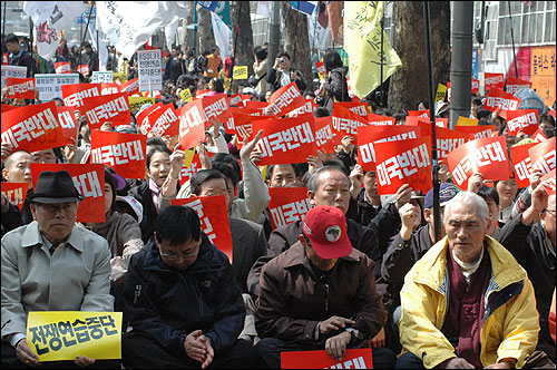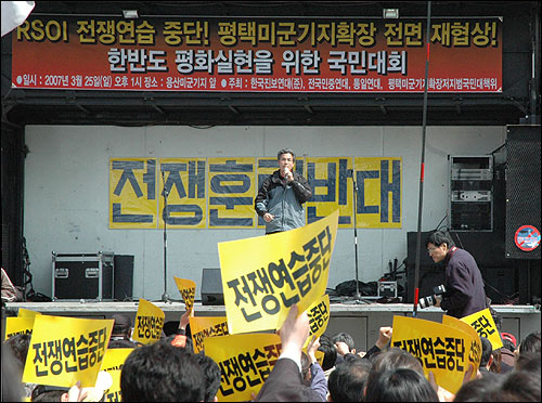 RSOI/FE ¿¬½ÀÀÌ ½ÃÀ۵Ǵ 25ÀÏ ¿ÀÈÄ 1½Ã, ¿ë»ê ¹Ì±º±âÁö ÁÖÇѹ̱º »ç·ÉºÎ ¾Õ¿¡¼´Â 700¿©¸íÀÇ ³ëµ¿ÀÚ, Çлý, ½Ã¹Î»çȸ´Üü ȸ¿øµéÀÌ Âü°¡ÇÏ¿© 'RSOI/FE Áß´Ü, ÆòÅà ¹Ì±º±âÁö Àü¸é ÀçÇù»ó, Çѹݵµ ÆòȽÇÇö ¹ü±¹¹Î´ëȸ'¸¦ ¿¾ú´Ù.