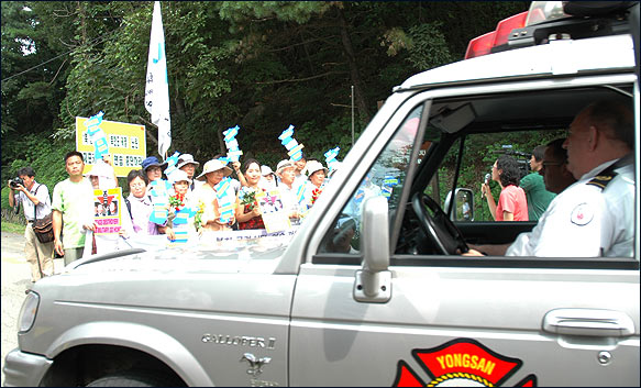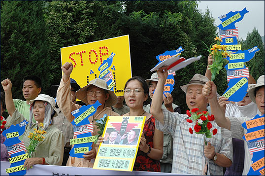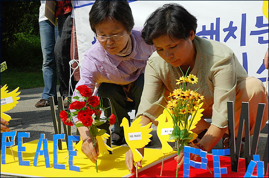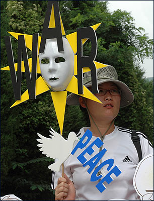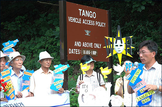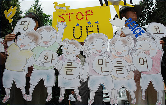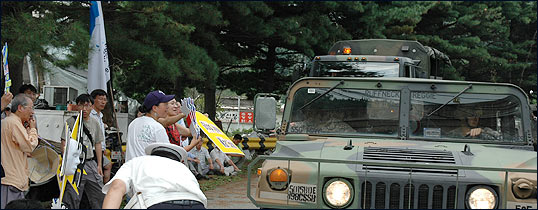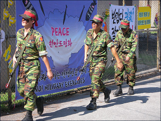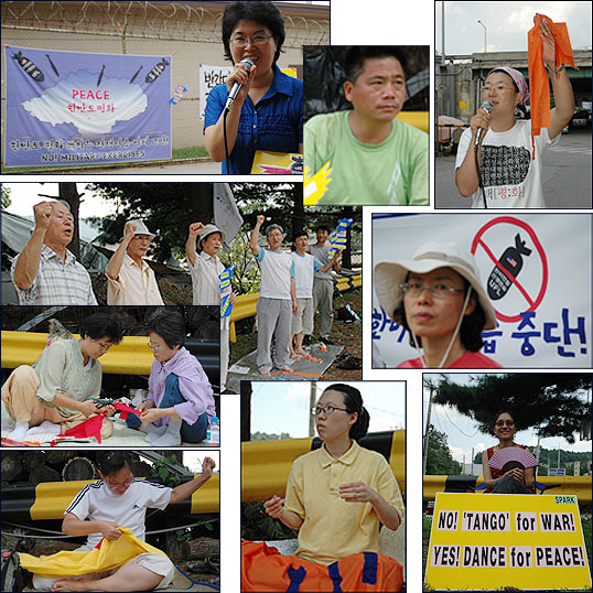 ¡â Á¤¹® Ãʼҿ¡´Â °æºÎ°í¼Óµµ·Î¿¡¼ ¹Ù·Î ºüÁ®³ª¿À´Â µµ·Î°¡ º¸¿´°í, ¹Ì±º Â÷·®ÀÌ ¼ö½Ã·Î ¿Ô´Ù°¬´Ù Çß½À´Ï´Ù. ±×·² ¶§¸¶´Ù Âü°¡ÀÚµéÀº "NO! WAR"¸¦ ¿ÜÄ¡¸ç ħ·« ¿¬½ÀÀ» Áß´ÜÇ϶ó´Â ¿ì¸®ÀÇ ¶æÀ» ¹Ì±ºµé¿¡°Ô Àü´ÞÇÏ¿´½À´Ï´Ù.