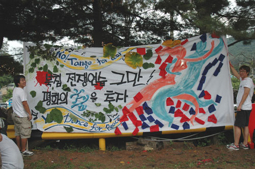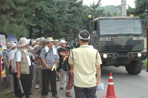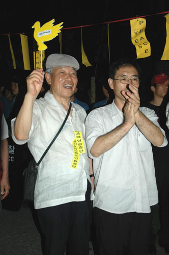 Âü°¡ÀÚµéÀº ¹®È­Á¦°¡ ÁøÇàµÇ´Â µ¿¾È ¿·À» Áö³ª´Â ¹Ì±º Æ®·°°ú ¹ö½º¸¦ ÇâÇØ '¾çŰ °íȨ'À» ¿ÜÄ¡±âµµ Çß½À´Ï´Ù. ¹Ì±ºµéÀº ¾ßÀ¯ÇÏ´Â ¼ÕÁþÀ» ÇØ´ë¸ç Âü°¡Àڵ鿡 ´ëÇÑ ¹Ý°¨À» Ç¥½ÃÇß½À´Ï´Ù. ¿ÀÈÄ 7½Ã 10ºÐ°æ, ¾îµÏ¾îµÏÇØÁø »ê ¾Æ·¡ Âü°¡ÀÚµéÀÌ µç ÃкÒÀÌ ´õ¿í ¹Ý¦°Å·È½À´Ï´Ù. Âü°¡ÀÚµéÀº ÆòÈ­ÀÇ ÃкÒÀ» µé°í ¸ðµÎ ÀϾ½À´Ï´Ù. '¿ì¸®ÀÇ ¼Ò¿ø'À» ÇÕâÇÑ Âü°¡ÀÚµéÀº ÅÊ°í ¾ÕÀ¸·Î ³ª¾Æ°¡ ÁغñÇÑ ²ö¿¡ ¼Ò¿øÁö¸¦ ´Þ°í ²öÀ» ÀâÀ¸¸ç ÆòÈ­ÀÇ ¶ì¸¦ ¸¸µé¾ú½À´Ï´Ù. ¼Ò¿øÁö¸¦ ´Þ±â À§ÇØ Âü°¡ÀÚµéÀÌ ÅÊ°í ¾ÕÀ¸·Î ³ª¼­ÀÚ¸¶ÀÚ °æÂûÀº º´·ÂÀ» ¸ðµÎ µ¿¿øÇÏ¿© ÅÊ°í ¾ÕÀ» °¡·Î¸·¾Ò½À´Ï´Ù. Âü°¡ÀÚµéÀº °æÂû¿¡ µîÀ» Áö°í ¼­¼­ 'À»ÁöÆ÷Ä¿½º·»Áî ¿¬½À Áï°¢ Áß´ÜÇ϶ó!´Â ±¸È£¸¦ ÈûÂ÷°Ô ¿ÜÄ£ ÈÄ À̳¯ ÇÏ·çÀÇ ¸ðµç ÀÏÁ¤À» ¸¶¹«¸®ÇÏ¿´½À´Ï´Ù.