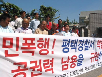 ¹ÎÁÖ³ëÃÑ ÆòÅþȼºÁö±¸ÇùÀÇȸ ÇöÈ£Çå ºÎÀÇÀåÀº "°øÃ»È¸Àå ¿¬´Ü ¹Ø¿¡¼ºÎÅÍ »çÁö°¡ µé¸°Ã¤ ¿¬´Ü Âʹ®À¸·Î ²ø·Á³ª¿À´Ï ³²Á¤¼ö À§¿øÀåÀÌ °æÂûµé¿¡ µÑ·¯½×¿© ¾ò¾î¸Â°í ÀÖ¾ú´Ù. °æÂûÄÞºñ ¾Õ±îÁö °¡´Ï °æÂûµéÀÌ ´õ ÀÖ¾ú°í À̵éÀº ÇÕ¼¼Çؼ Æø·ÂÀ» Èֵѷ¶°í °æÂûÄÞºñ ¿Ã¶ó°¡´Â °è´Ü¿¡ ¾þ¾î³õ°í 3¸íÁ¤µµ°¡ ¸¶±¸ ¿åÇÏ¸ç Æø·ÂÀ» Èֵѷ¶´Ù."¸ç Àΰ£ÀÇ Á¸¾ö¼ºÀ» ¸»»ìÇÏ´Â °æÂûÀÇ ÇàÅ¿¡ ºÐ³ëÇÑ´Ù°í °Á¶ÇÏ¿´´Ù.