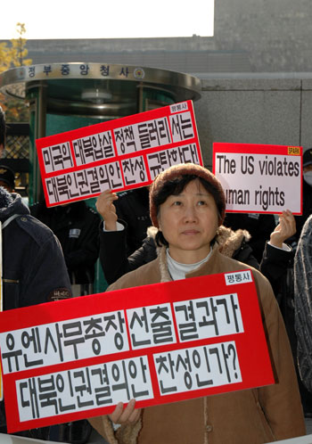 ½Çõ¿¬´ë ±Ç¿Àâ ´ëÇ¥´Â "ÅëÀϺÎ, ±¹Á¤¿øÀÇ ¹Ý´ë¿¡ ¸Â¼ Âù¼º ¹æÄ§À» °üö½ÃŲ ¿ÜÅëºÎ¸¦ ¿À´ÃºÎÅÍ ¸Å±¹Åë»óºÎ·Î ºÎ¸£ÀÚ"¸ç ¿ÜÅëºÎ ´ç±¹À» ºñÆÇÇϰí 1µî ÀÎ±Ç Ä§ÇØ±¹ ¹Ì±¹ÀÌ ºÏ¿¡ ´ëÇØ ÀαÇÀ» ¸»ÇÒ ÀÚ°ÝÀÌ ¾ø´Ù"°í ±ÔźÇß´Ù.