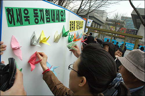 Áýȸ Âü°¡ÀÚµéÀº Çã¼¼¿íµ¿ÁöÀÇ ÄèÀ¯¸¦ ±â¿øÇÏ¸ç ÆíÁö¸¦ ¾²°í ÇÐÀ» Á¢¾ú´Ù. Çã¼¼¿íµ¿Áö°¡ °Ç°À» µÇã°í ÇѹÌFTA°¡ Æó±âµÇ±â¸¦ ¹Ù¶õ´Ù.