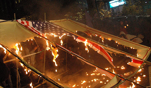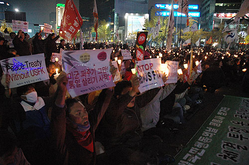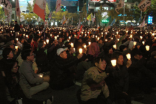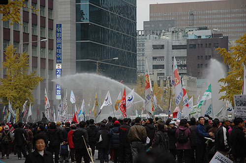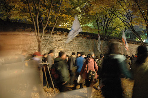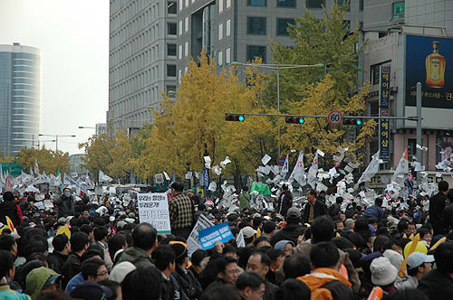 "ÇöÀç Âü°¡ÀÚµéÀº Á¾·Î±¸Ã» ¾Õ µµ·Î±îÁö ¹Ð·Á¿Í °æÂû°ú ´ëÄ¡ÁßÀÌ´Ù. ±×·¯³ª ¹Ìó ÈÄÅðÇÏÁö ¸øÇÑ ÀϺΠÂü°¡ÀÚµéÀº µµ·Î °÷°÷¿¡¼ °æÂûÀÇ Æø·Â¿¡ ¹«¹æºñ·Î ³ëÃâµÅ Å©°í ÀÛÀº ºÒ»ó»ç°¡ ÀϾ°í ÀÖ´Ù."(¹ÎÁßÀÇ ¼Ò¸®, ¿ÀÈÄ 5½Ã 20ºÐ ÇöÀç)