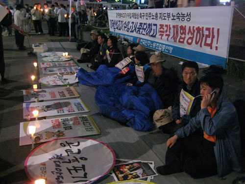 ¿ÀÀü¿¡´Â ¹ÎÁÖ³ëÃÑÀÌ ±âÀÚȸ°ßÀ» ÅëÇØ °æÂûÀÇ °Á¦Áø¾Ð°ú ½Ã¹Î¿¬ÇàÀ» ±ÔźÇÏ°í ¹Ì±¹»ê ¼è°í±â ¼öÀÔ ÀçÇù»óÀ» Ã˱¸Çϸç û°è±¤Àå¿¡¼ ö¾ß ³ë¼÷ ³ó¼º¿¡ µ¹ÀÔÇßÀ¸¸ç, ¿ÀÈÄ¿¡´Â ±¹¹ÎÁֱǼöÈ£½Ã¹Î¿¬´ë ȸ¿ø 600¸íÀº ´ëÇзο¡¼ `»ý¸íÁÖ±Ç ¼öÈ£ Áýȸ'¸¦ ¿¾î ¹Ì±¹»ê ¼è°í±â ¼öÀÔ Àü¸é ±ÝÁö¸¦ Ã˱¸ÇÑµÚ À̰÷ û°è±¤Àå±îÁö °Å¸®ÇàÁøÀ» ¹ú¿´½À´Ï´Ù.